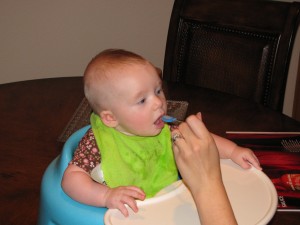Eating rice cereal – You’ve officially learned the use of a spoon! Any spoon you get goes straight into your mouth, whether it has food on it or not. One of the best “toys” right now is a metal spoon from our silverware. Or a spoon at a restaurant. Or a plastic disposable spoon. Doesn’t matter … spoons are made to go in your mouth and you know what to do with it! You’ll also help me guide the spoon into your mouth when it’s time to eat. You’re so smart!