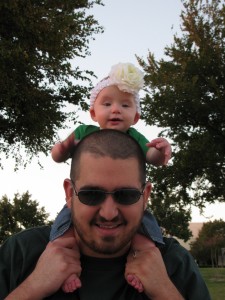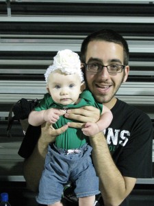 Tuesday night Grandpops brought over a new little Dragon onesie for Kamy to wear to the game. I have to admit it’s pretty cute on her! She is at the age right now where it’s hard to tell that she’s a girl, so I paired the outfit with her white flower bow to make it clear. =)