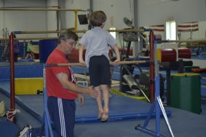 Caden has essentially been in semi-private lessons at gymnastics all summer! Coach Tom is trying to get a new batch of boys in pre-team, and there are just a handful of boys who are active during the summer. Â In Caden’s pre-team class there is one other boy and the first week it was just him! Â In his regular boys class, there is also one other gymnast, so Caden is getting a LOT of time on the equipment. Â Since Coach Tom coaches both classes, the only real difference is the length of the session and how many apparatus they use.