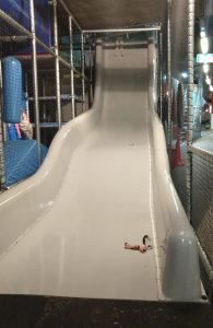 After lunch, Keller went back to the apartment and I took the kids to TunFun.  It was a cold, kind of wet, typical early spring day in Amsterdam, so an indoor activity was just the thing.  TunFun had a massive drop slide too — I’ve never seen a slide so steep!  One thing is for sure, you can definitely hurt yourself on a Dutch playground!  Of course, once they worked up the nerve to try the slide, it was their favorite thing there!  In the second photo you can see Caden sitting at the top of the slide … those are his legs dangling down!