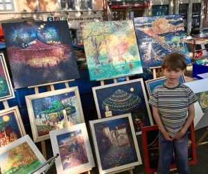And we bought a painting! We were hoping to find a painting as a reminder for our trip (as we did in NYC), and when we saw this piece we were both drawn to it. It is a fantastical combination of many famous buildings and iconic buildings here in Lyon — The Basilica, the St. George and St. Jean Churches, the Opera house, and the Roman ampitheater. It’s intriguing and different and really reminds me of some of Escher’s pieces. We balked at the list price, but Keller returned a bit later with cash in hand and made an offer that was accepted! We now have to figure out how to ship it home safely (and affordably), but we have it! It may or may not be on the mantle in our AirBNB right now. 😉