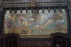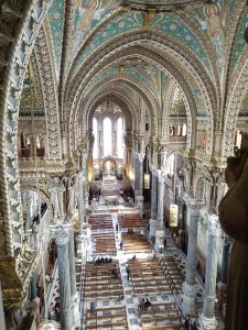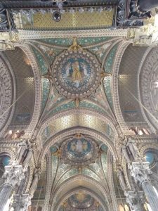 We’d initially planned to meet Joan and Mike today, but their plans changed last minute due to a repairman. So the four of us took the funicular up the hill to explore the Basilica Notre Dame de Fourviere. It is a spectacular Catholic church built in 1872 in honor of Mary in thanks for preserving the city during the Prussian war. The exterior is very grand but the interior is stunning! The mosaics are incredible — on the floor, walls, and ceilings.