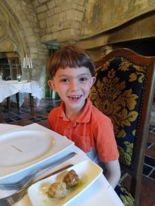 We arranged to have dinner at the Chateau — they offer a fixed menu to hotel guests only, in the castle, so it was very intimate. Fabian, the hotel manager also serves as the chef and waiter, and he was able to adjust the menu so the kids could enjoy dinner too. There was a roaring fire, delicious food, and incredible ambiance. The kids even tried escargot! It was very memorable!