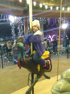 One afternoon, Oma, the kids, and I went down to Denver. We started at the Natural History Museum and explored there for a few hours. Next we grabbed dinner and then went to the Zoo Lights display at the Denver Zoo. The kids loved all the creative animal displays and Kamy even got to ride on the carousel. It was cold though!